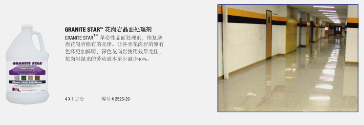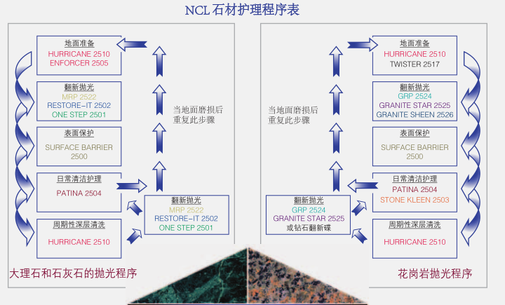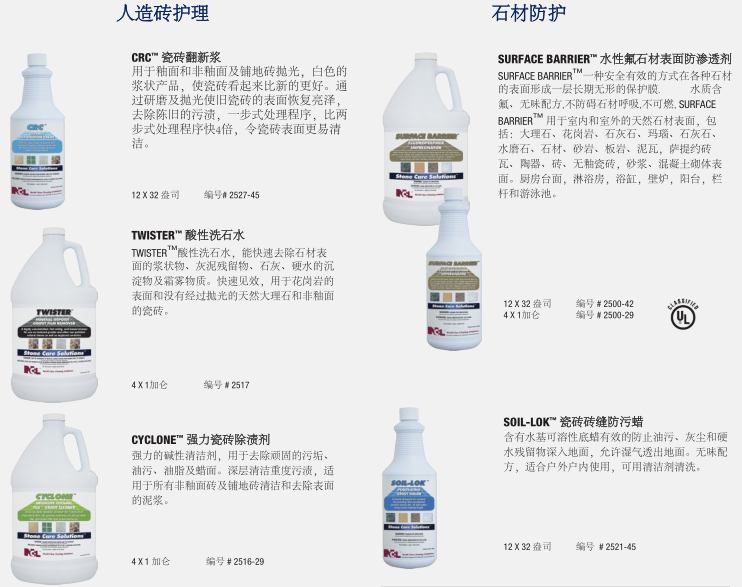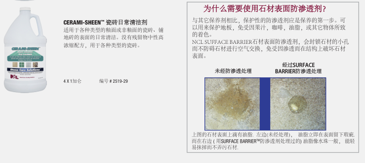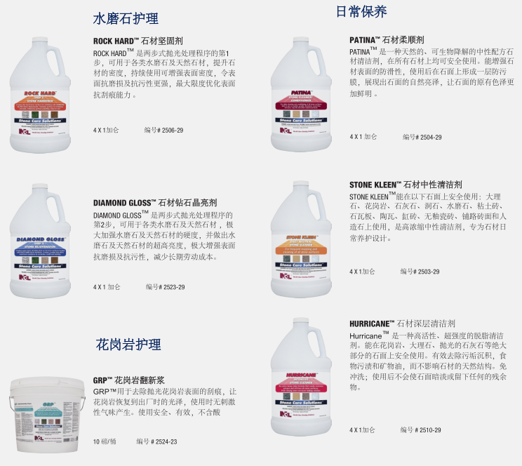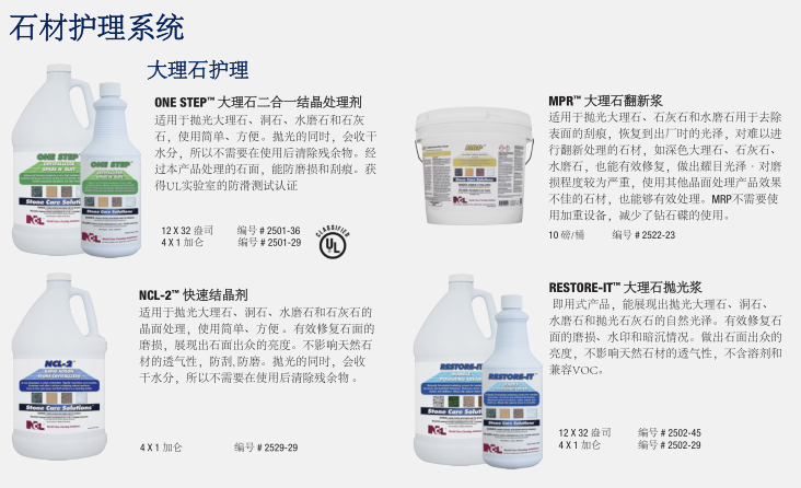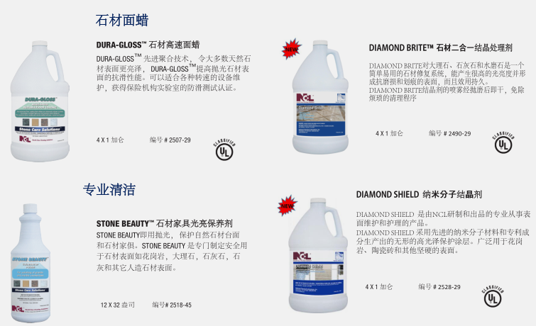 NCL的石材護(hù)理系統(tǒng)™對(duì)天然石材和陶瓷表面光澤的保持維護(hù)和修復(fù)是一個(gè)完整的、專業(yè)的系統(tǒng)。這種協(xié)調(diào)的系統(tǒng)在保持和修復(fù)天然石材地面,臺(tái)面保持高光澤度的同時(shí)防止表面的污漬侵蝕。50多年來NCL 生產(chǎn)了衛(wèi)生維護(hù)專業(yè)人士信任的高質(zhì)量以及高性能的產(chǎn)品。在NCL,我們所有的創(chuàng)新的產(chǎn)品和杰出表現(xiàn)的系統(tǒng)設(shè)計(jì)的發(fā)展方向是節(jié)省您的時(shí)間,勞動(dòng)強(qiáng)度和費(fèi)用。石材護(hù)理系統(tǒng)™為您提供任何天然石材或瓷磚表面高性能安全,專用維護(hù)產(chǎn)品。這個(gè)全面的計(jì)劃是專為建筑服務(wù)承包商和內(nèi)部設(shè)施服務(wù)提供商設(shè)計(jì),并不需要多年的技術(shù)經(jīng)驗(yàn)與研磨方法!